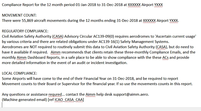 At the required intervals, compliance reports are automatically emailed with the detail required by the Aviation Authority for each Aimm Client airport, to suit their Country and Certificated status.